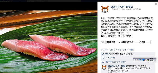 手前味噌な話で恐縮ですが、先日、私がキャプション(簡単な説明文書)を書いた「初鰹の握り」の画像には、950を超える「いいね!」と47件ものシェアをして頂きました。くことができました。